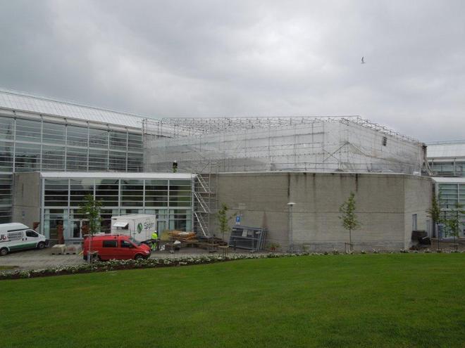 Stillas og Tak over Tak konstruksjon ble montert på betongdekke over Tjodhallen, 8m over bakkenivå.